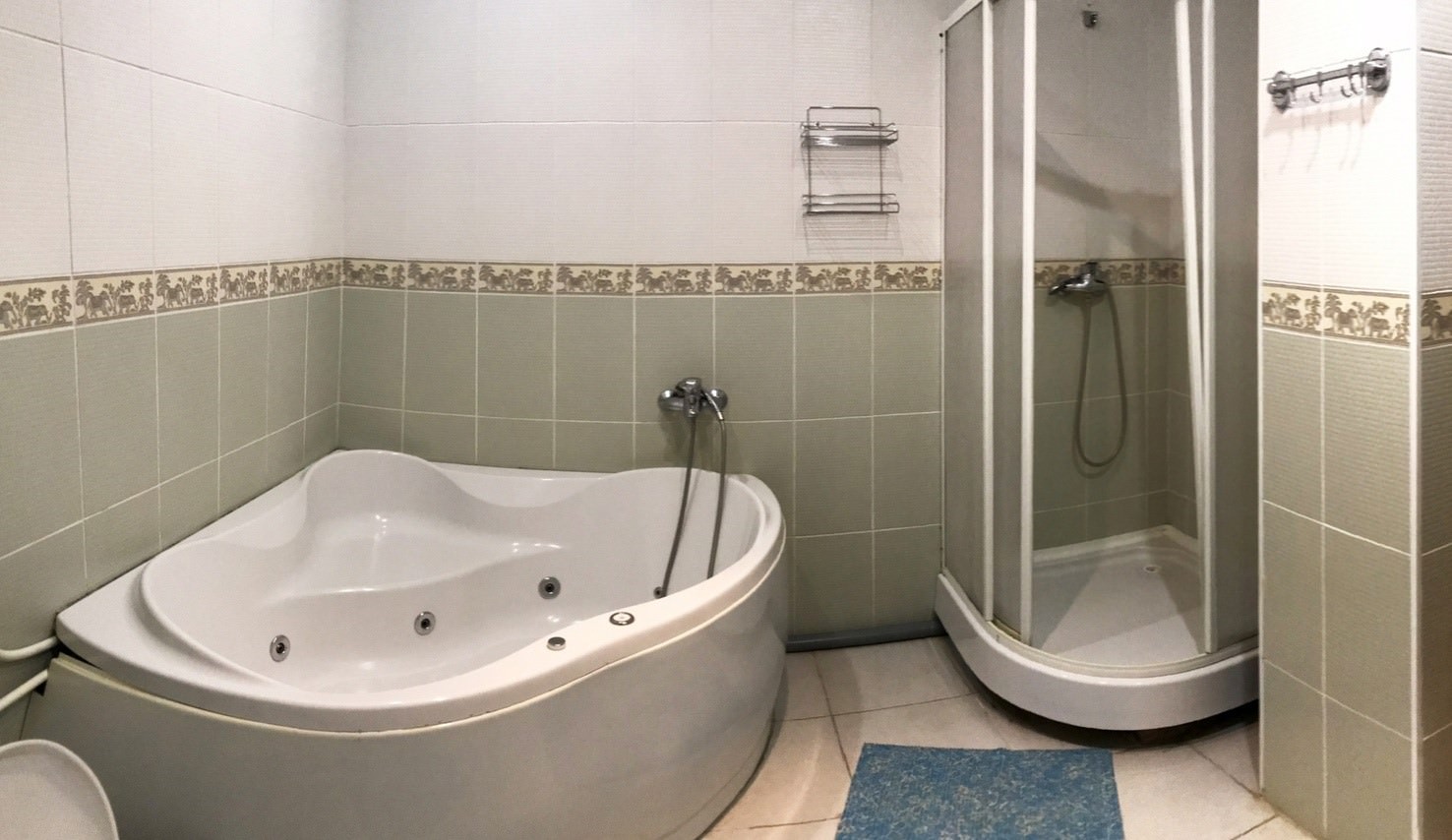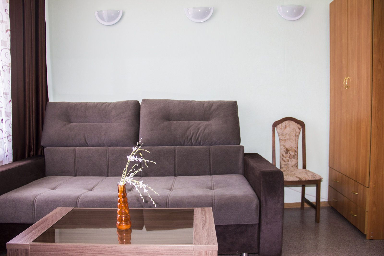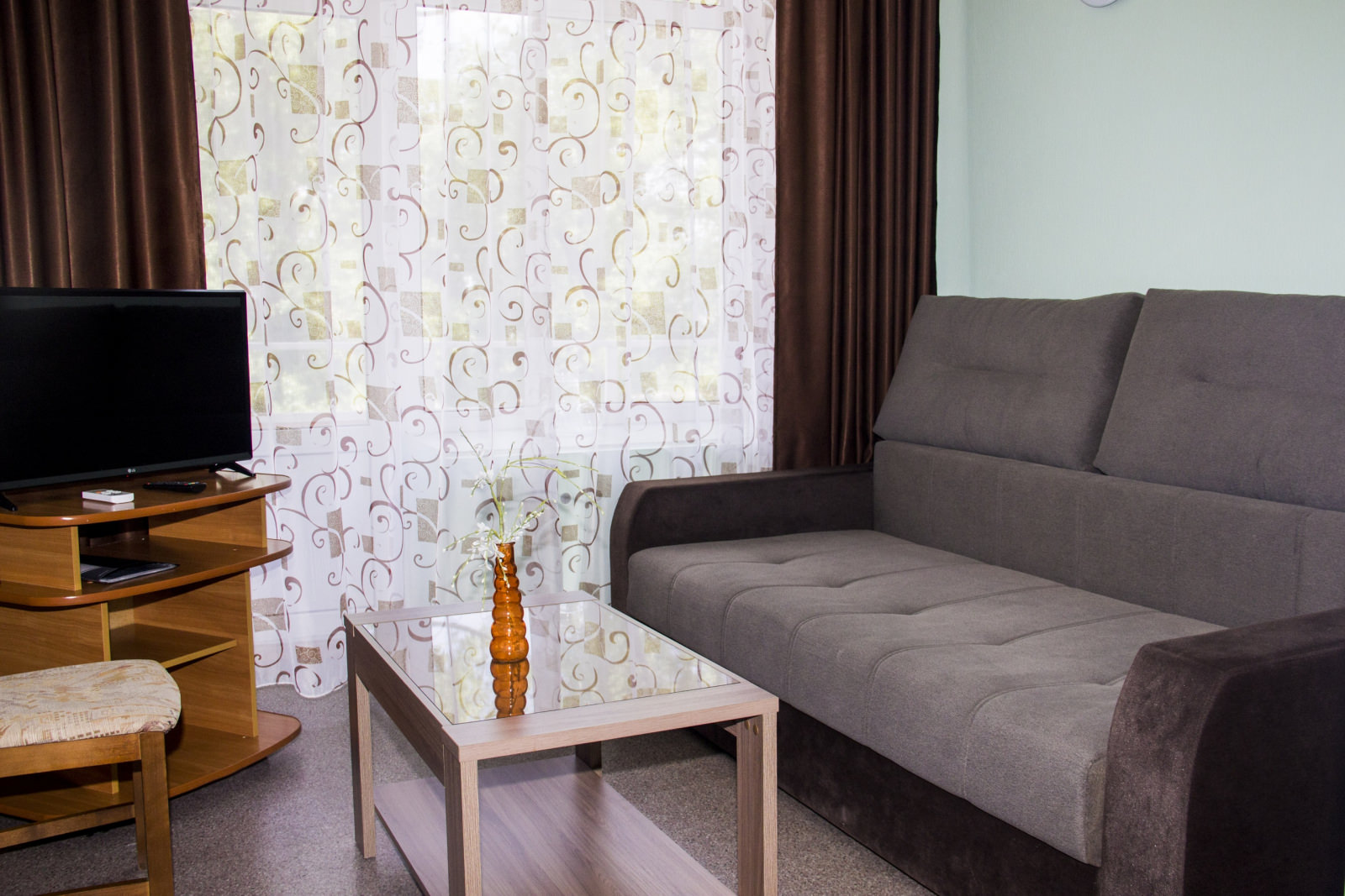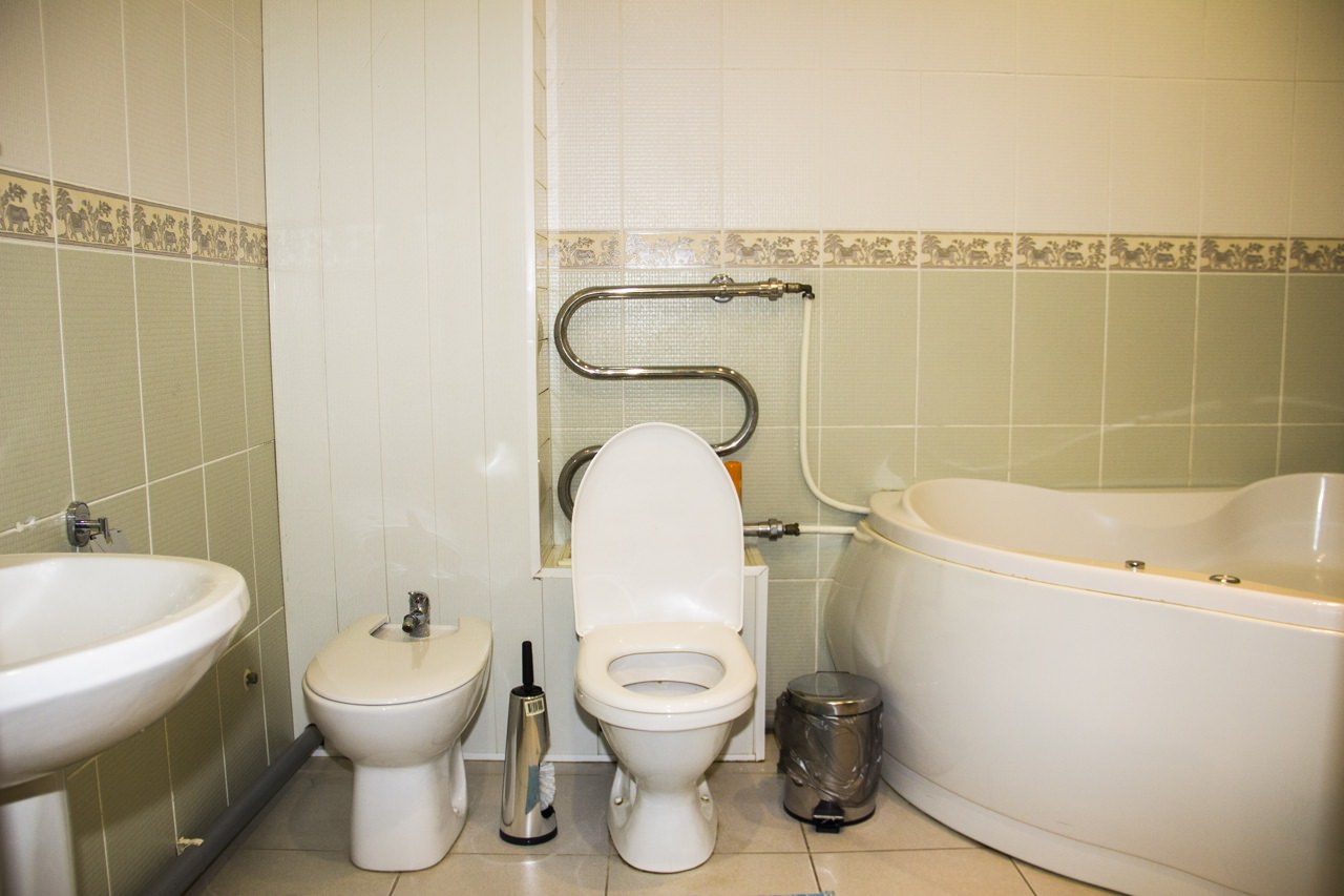 2 осн. места. 1 доп. место. Мебель: диван, зеркало, кровать двуспальная, прикроватные тумбочки, столик журнальный, стулья, шкаф. Оборудование: кондиционер, микроволновая печь, телевизор, холодильник, чайный набор посуды, электрочайник. Санузел: биде, с джакузи, фен, халат. Сервис: Wi-Fi бесплатно, смена полотенец, смена постельного белья, уборка номера.